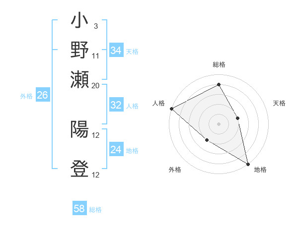 小野瀬 陽登さんの総格は58画の4点!