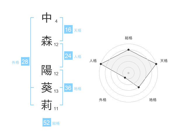 中森 陽葵莉さんの総格は52画の4点