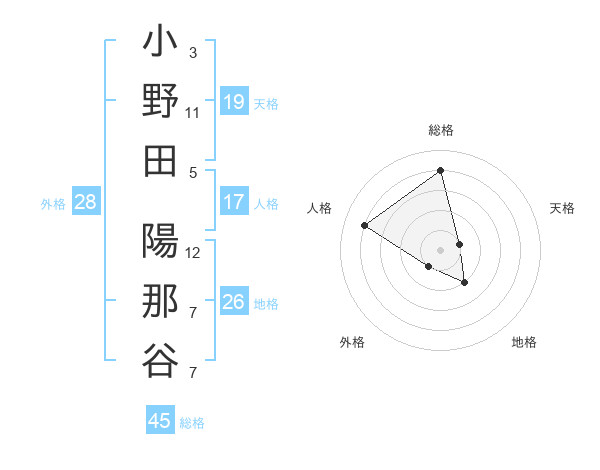 小野田 陽那谷さんの総格は45画の4点!