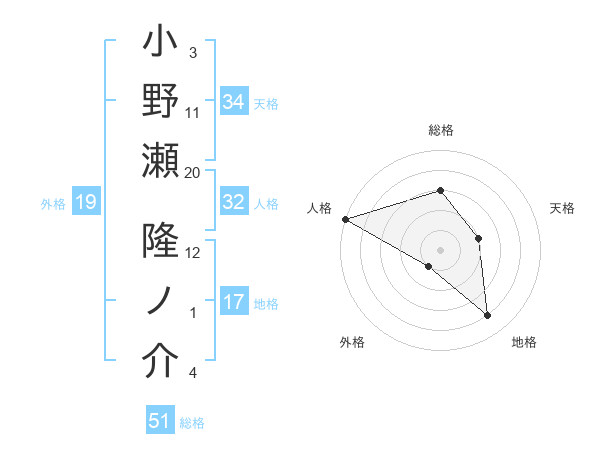 小野瀬 隆ノ介さんの総格は51画の3点!