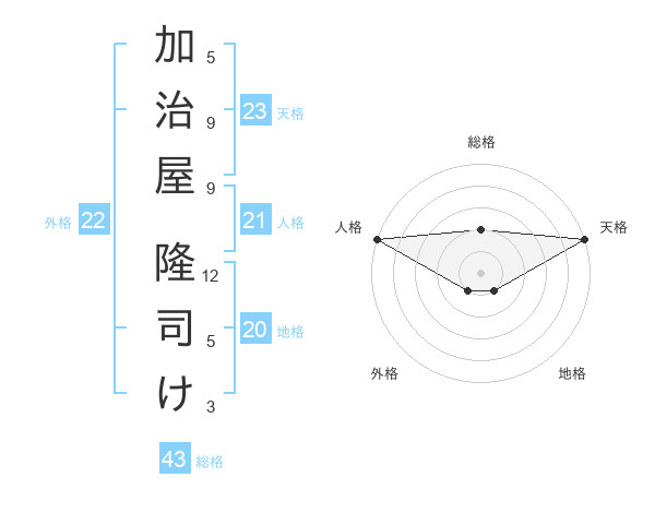 加治屋 隆司けさんの天格は23画の5点!