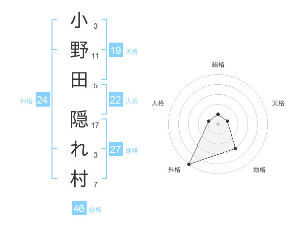 小野田 隠れ村さんを姓名の画数から五運を鑑定