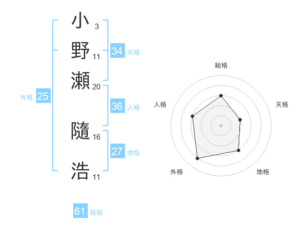 小野瀬 隨浩さんの総格は61画の3点!