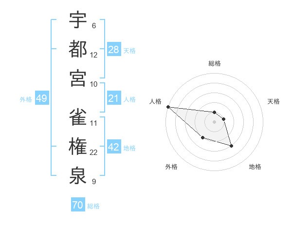 宇都宮 雀権泉さんを姓名の画数から五運を鑑定