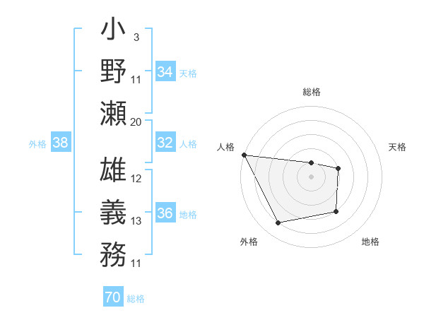 小野瀬 雄義務さんを姓名の画数から五運を鑑定