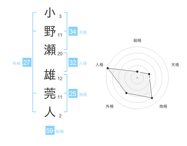 小野瀬 雄莞人さんの総格は59画の1点!