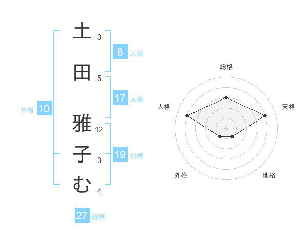 土田 雅子むさんを姓名の画数から五運を鑑定
