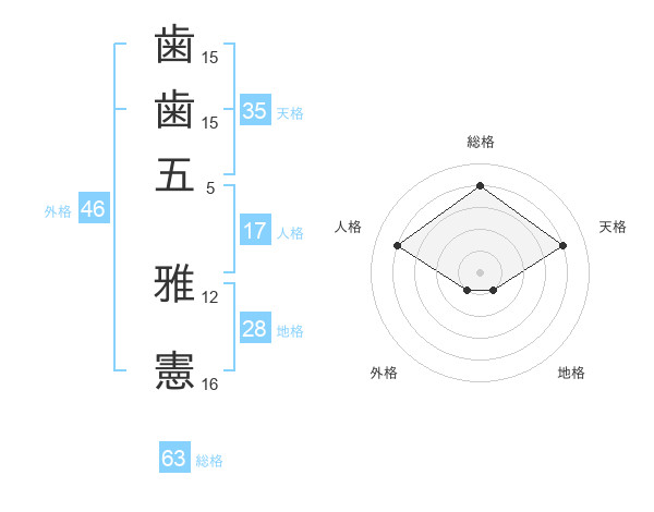 歯歯五 雅憲さんの総格は63画の4点!