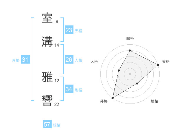 室溝 雅響さんの総格は57画の4点!