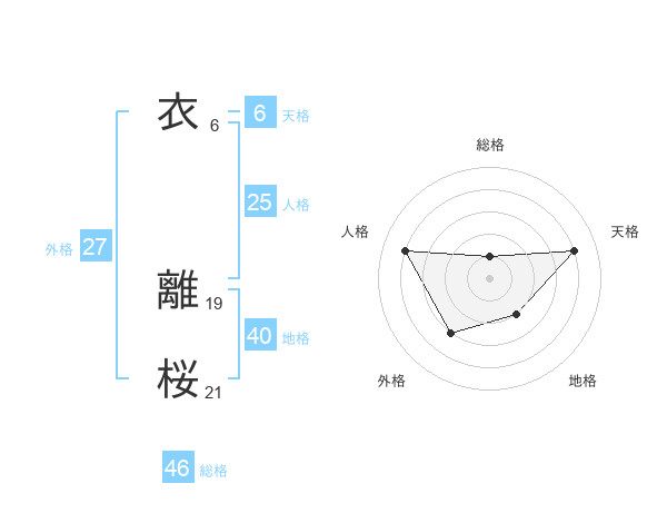衣 離桜さんの総格は46画の1点!