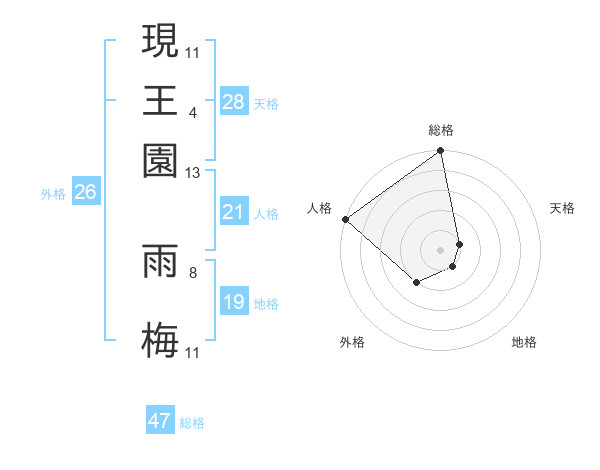 現王園 雨梅さんを姓名の画数から五運を鑑定