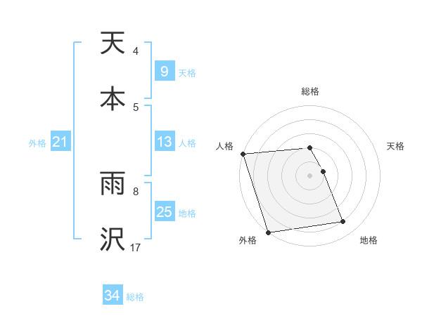 天本 雨沢さんの総格は34画の2点!