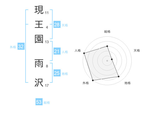 現王園 雨沢さんを姓名の画数から五運を鑑定
