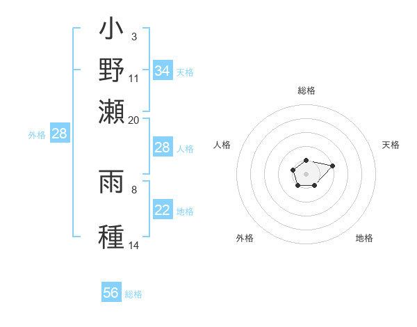 小野瀬 雨種さんを姓名の画数から五運を鑑定