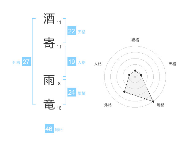 酒寄 雨竜さんを姓名の画数から五運を鑑定