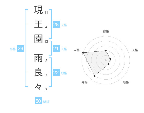 現王園 雨良々さんを姓名の画数から五運を鑑定