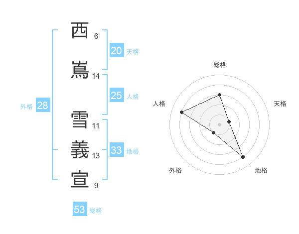 西嶌 雪義宣さんを姓名の画数から五運を鑑定