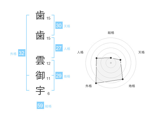 歯歯 雲御宇さんの外格は32画の5点!