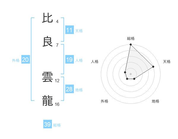 比良 雲龍さんを姓名の画数から五運を鑑定