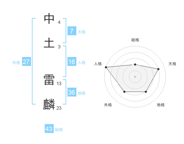 中土 雷麟さんの総格は43画の2点!