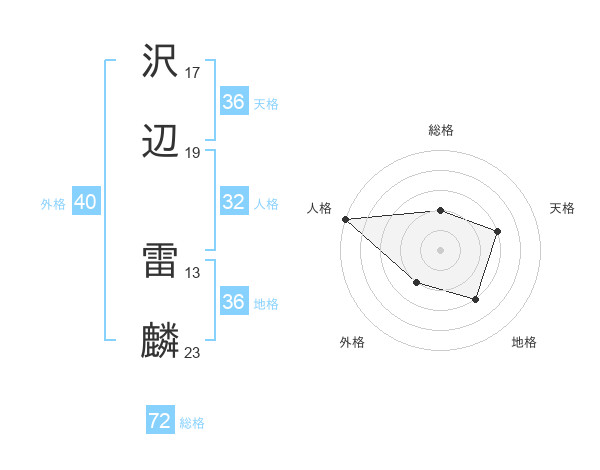 沢辺 雷麟さんの総格は72画の2点!