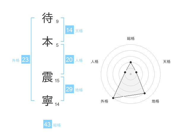 待本 震寧さんの外格は23画の5点!