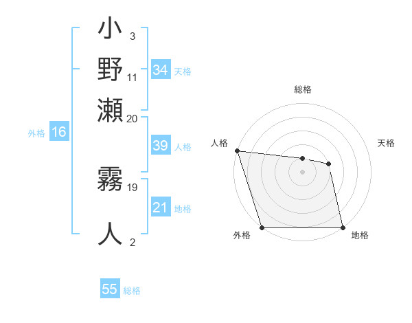 小野瀬 霧人さんを姓名の画数から五運を鑑定