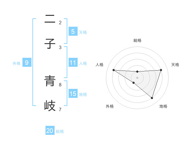 二子 青岐さんの総格は20画の1点!