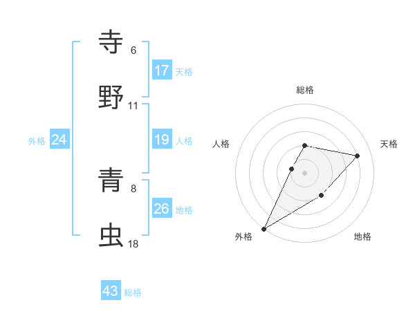 寺野 青虫さんの総格は43画の2点!