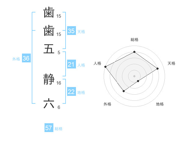 歯歯五 静六さんの総格は57画の4点!