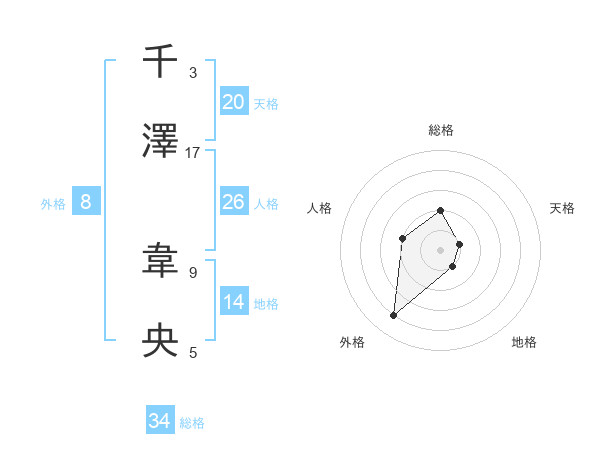 千澤 韋央さんを姓名の画数から五運を鑑定