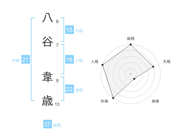 八谷 韋歳さんの総格は37画の5点!