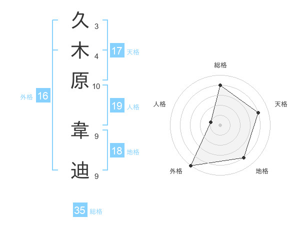 久木原 韋迪さんを姓名の画数から五運を鑑定
