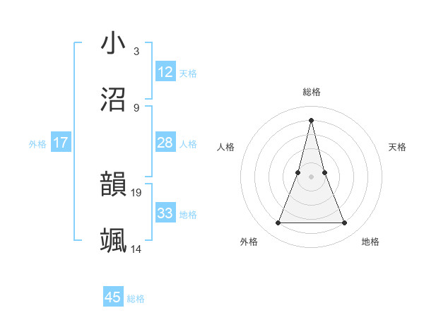 小沼 韻颯さんの総格は45画の4点!