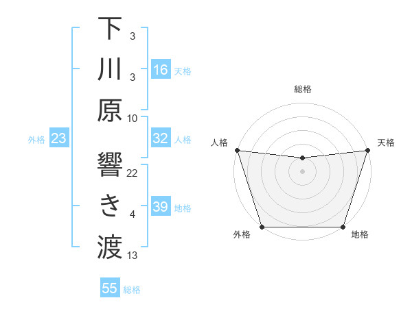 下川原 響き渡さんの総格は55画の1点!