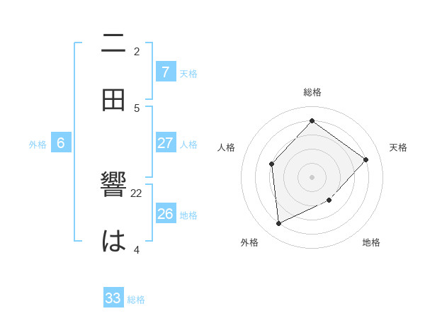 二田 響はさんの総格は33画の4点!