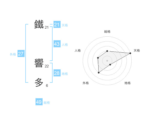鐵 響多さんの天格は21画の5点!