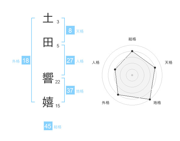 土田 響嬉さんを姓名の画数から五運を鑑定