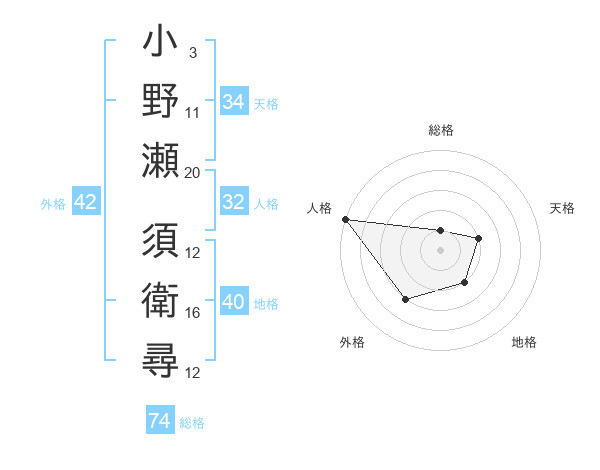 小野瀬 須衛尋さんの総格は74画の1点!