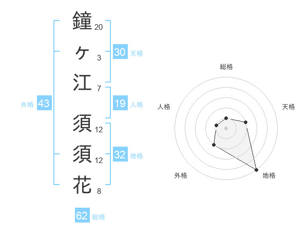 鐘ヶ江 須須花さんの総格は62画の1点!