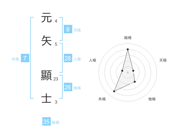 元矢 顯士さんの総格は35画の4点!