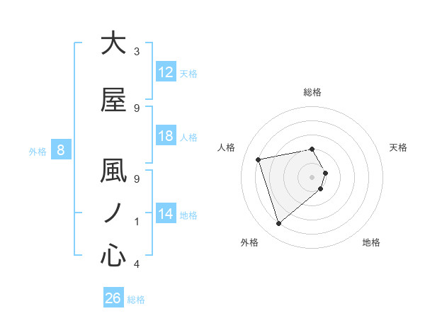 大屋 風ノ心さんを姓名の画数から五運を鑑定