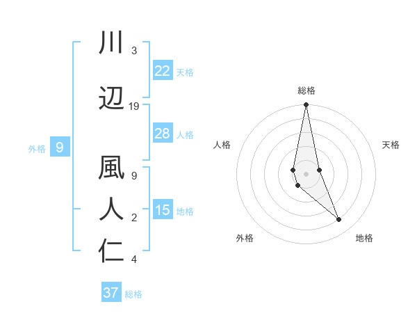 川辺 風人仁さんの総格は37画の5点!