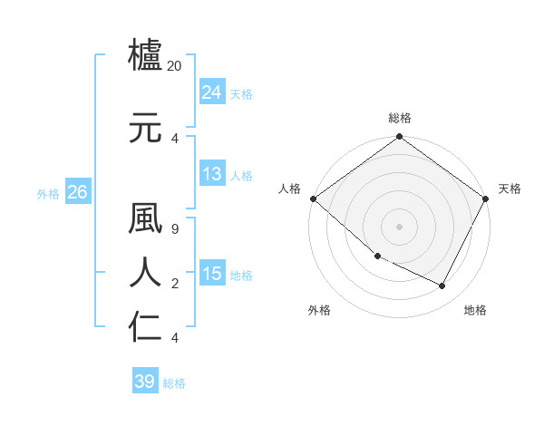 櫨元 風人仁さんの総格は39画の5点!