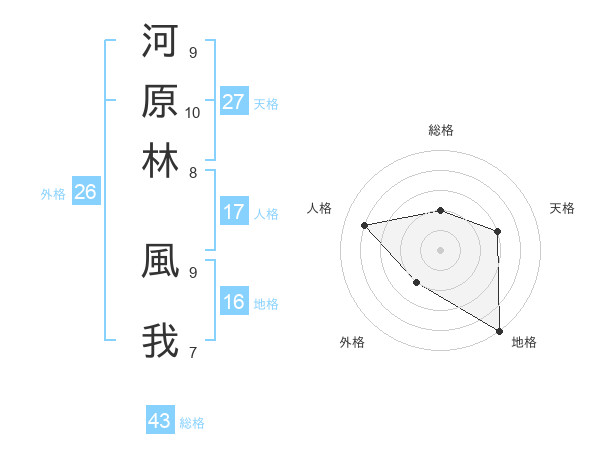 河原林 風我さんの総格は43画の2点!
