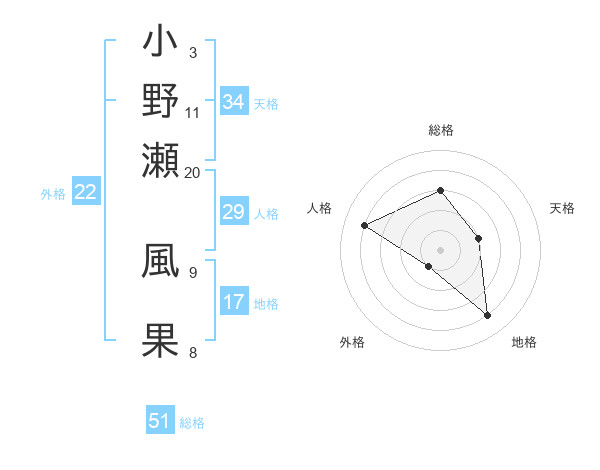 小野瀬 風果さんを姓名の画数から五運を鑑定
