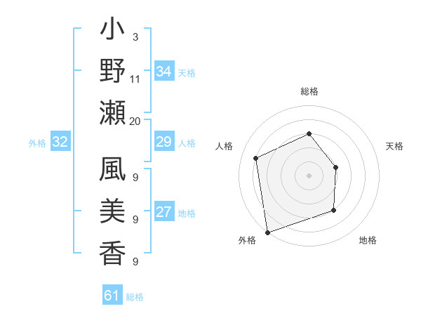 小野瀬 風美香さんを姓名の画数から五運を鑑定