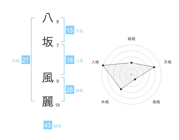 八坂 風麗さんの総格は43画の2点!