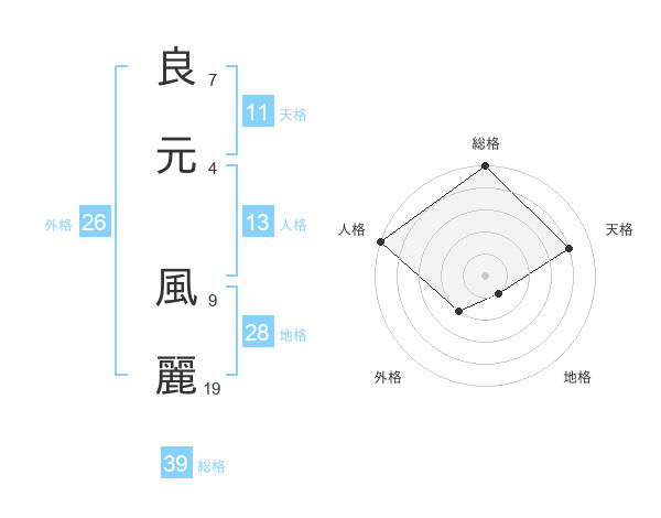 良元 風麗さんの総格は39画の5点!