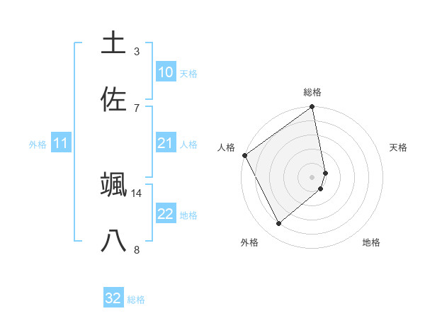 土佐 颯八さんを姓名の画数から五運を鑑定